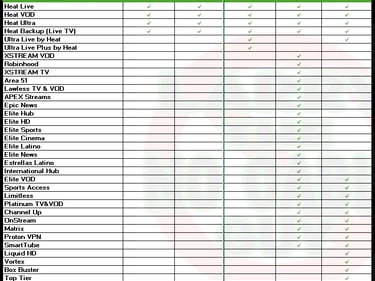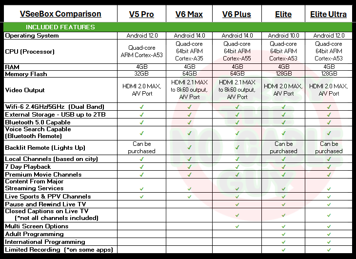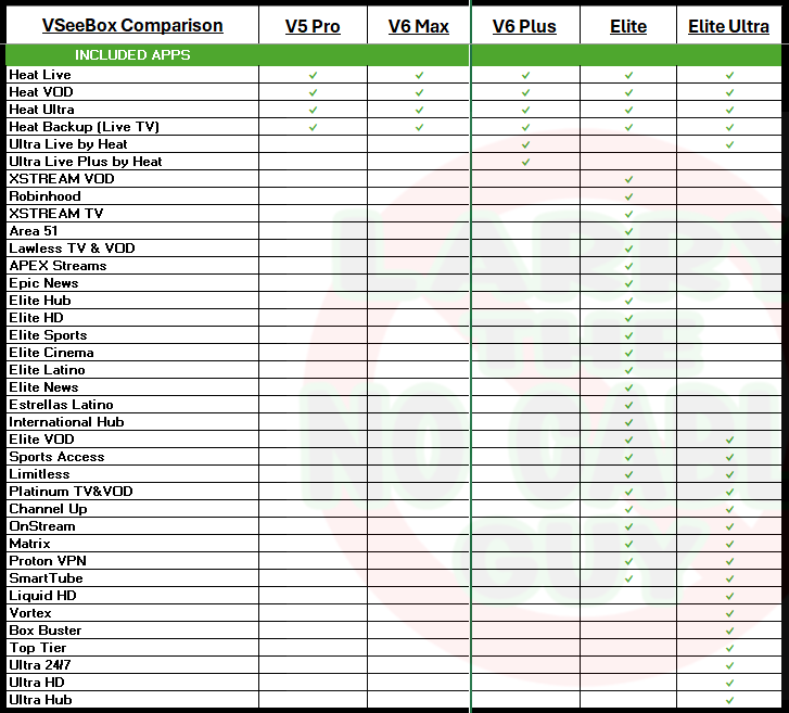 All of the boxes have the 4 proprietary Heat Apps included. They give you around 2000 live tv channels including locals, premium movie channels, all major sports, PPV and more! Plus you'll have access to over 40,000 on demand movies and TV shows from all the major networks and streaming services without all the subscriptions or having to switch between a bunch of different apps. There is also a 7 day playback feature on most major channels that allows you go back up to one week and watch a program without having to remember to record it first.